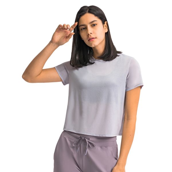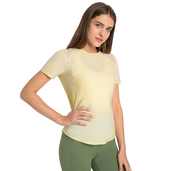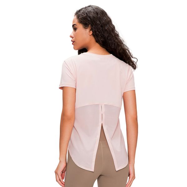 Spring and Summer New Open Back Stitching Mesh Sports Short Sleeve Women Quick Dry Breathable Lightweight Ice Yoga Fitness Suit Gym Wear$6.1