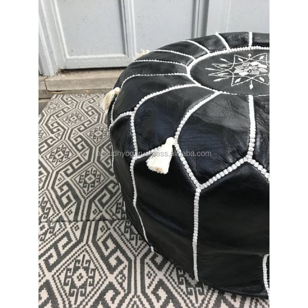 Black Moroccan Leather Pouf with Stitching & Tassels$50