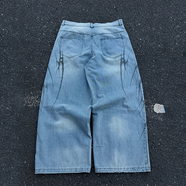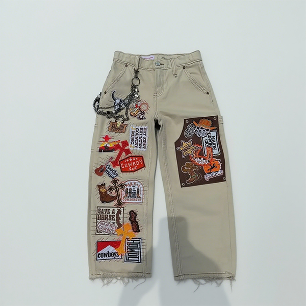 Wholesale Custom Streetwear Vintage Pattern Embroidered Denim Baggy Track Pants Jeans High Quality Patchwork Wide Leg Sweatpants$12.5