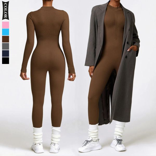 Women's Stylish Front Half Zip Long Sleeve Activewear Bodysuit Sexy Backless Design Slim Sports Fitness Yoga Jumpsuit$7.8